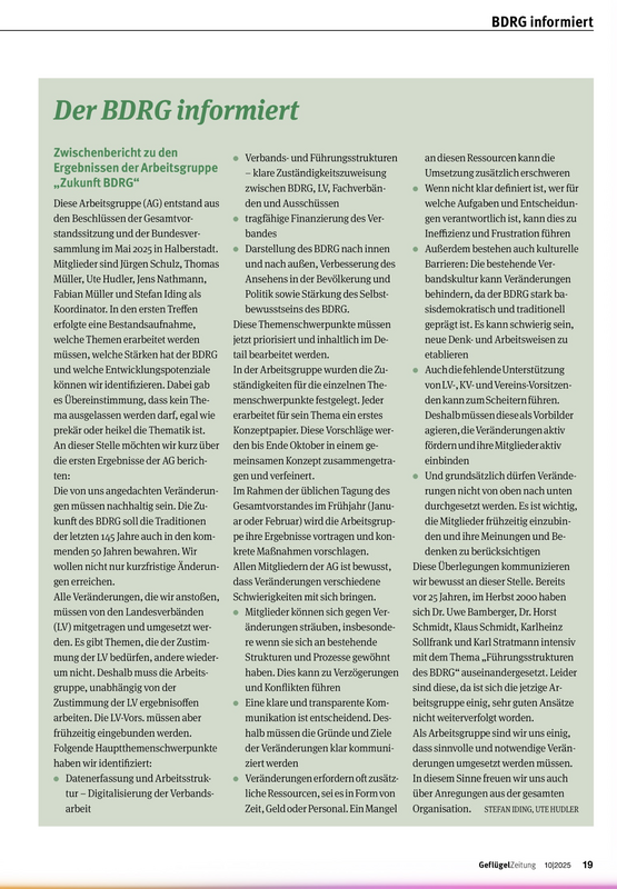 Hast du Anregungen oder Ideen zur Zukunft unseres Hobbies und des BDRG? Dann schreib uns gerne an zukunft@bdrg.de! Die „Arbeitsgruppe Zukunft“ des BDRG hat sich und ihre Arbeit in der Geflügelzeitung 10/2025 vorgestellt und freut sich sehr über deine konstruktiven Vorschläge.