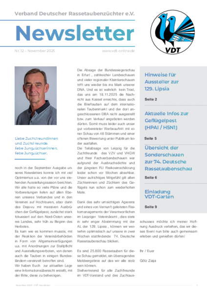 Gemäß der Teilentziehung der Schaugenehmigung für Geflügel dürfen ausschließlich Tauben ausgestellt, verkauft oder auf das Messegelände verbracht werden.