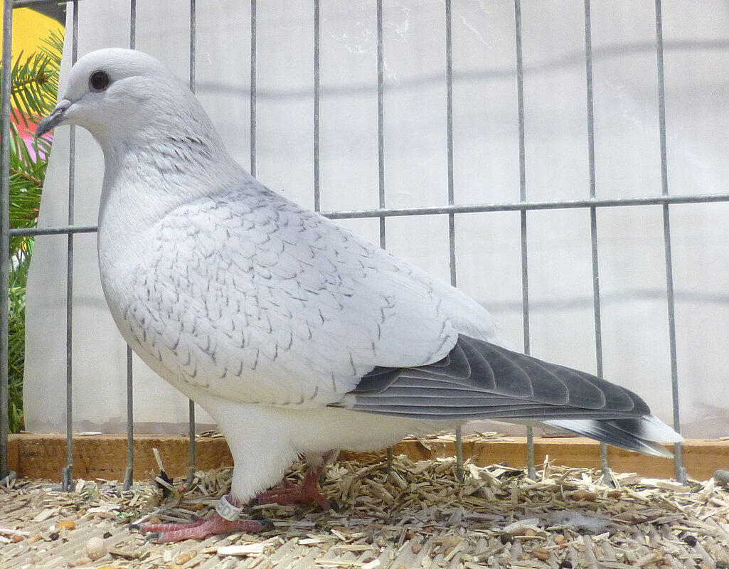 Die Weißgeschuppten waren immer sehr beliebt, leider sieht man sie in letzter Zeit selten in großer Anzahl bei den Sonderschauen. Auf eine durchgefärbte Schwanzbinde muss nach wie vor Wert gelegt werden. Die Schuppung ist Hauptrassemerkmal und geschlechterspezifisch differenziert zu beurteilen. Wie bei den glattfüßigen und eigentlich allen Farbentauben auch, sind die Täuber oft nicht so exakt in der Schuppungsschärfe und Schuppungsverteilung wie die Täubinnen. Der Schuppungsreinheit ist immer Aufmerksamkeit durch Züchter und Preisrichter zu schenken. Auch muss die Eisfarbe in den Bereichen Kopf, Hals, Nacken, Keil und Oberschwanz genau in Augenschein genommen werden. Hochrassige Vertreter sind immer eine Augenweide auf den Schauen und ein Ergebnis von großem Züchterfleiß.