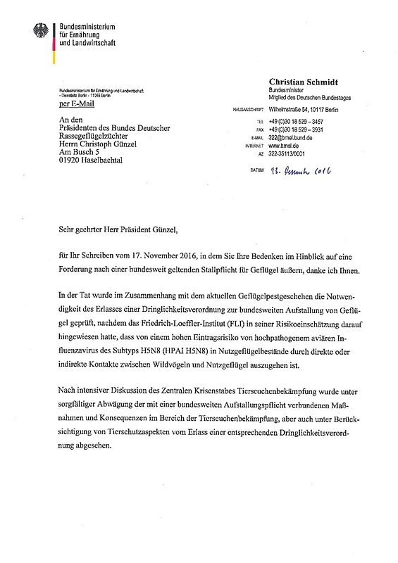 nachfolgend finden Sie die Antwort auf mein Schreiben an den Bundesminister für Ernährung und Landwirtschaft, Hr. Christian Schmidt, hinsichtlich einer bundesweiten Stallpflicht.